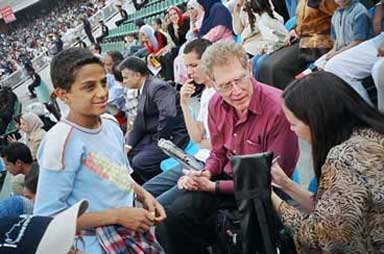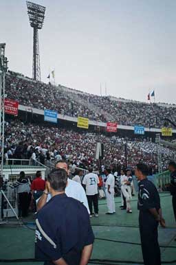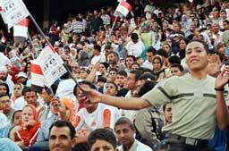 Happy with the reception from the crowd during our first show, we began looking forward even more to our performance on the main stage. After scheduling delays which, for a while, cast doubts on whether there would even be time for all of us, we were invited up to the main stage in the center of the Cairo Stadium. The crowd erupted with appreciation as they heard our voices... They clapped and sang along at the climactic moments in the music... We began with "Habibi Aini"... I sang a vocal taqasim (improvisation) which allowed me to pour full expression out into the crowd... They screamed with appreciation... We then played "Daret el Ayam" and Kristina's voice carried the crowd into their deep love for Um Kolthoum... We could hear thousands of them singing along with us. We finished with an Amr Diab hit: "Habibi ya Nour el Ayeen"... We sang it too fast and the guitar, which I had purchased for $60 from my friend Naser on Mohammad Ali Street only the night before, sounded terribly metallic... But we felt welcome and we felt appreciated... We wove our path from TV interview to TV interview in the deafening arena surrounding the stage... We signed autographs and shook hands in the crowd for the next hour or so... We finally found a place to rest and, with some of our growing network of friends, both Egyptian and American, who have been surrounding and supporting us, eventually enjoyed a bowl of kosheree, one of the delicious spicy vegetarian Egyptian countryside dishes. Thank you Pat! Thank you Miriamah! Thank you Dr. Sharrif! Thank you Gamal! Mustafa...! At the end of the evening, after a long parade of the latest top Egyptian popular singers, Amr Diab, the most popular singer of them all, was whisked magically onto the stage and we all enjoyed his energetic performance.