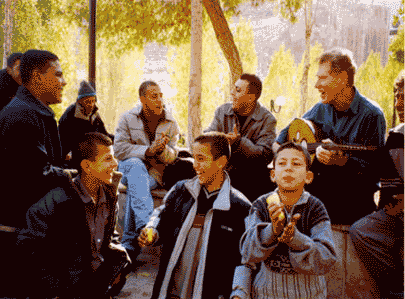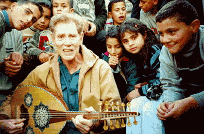 We sing another song, an Iraqi song this time... The children are gathering in a tighter and tighter group around us. Soon the group is at least one hundred. They clap and sing along. When we finish a song, they cheer. Some of the older folks begin to approach and sing with us too. Suddenly a young boy grabs my oud neck and prevents me from continuing... The call to prayer has begun in the background from a nearby mosque. We wait until the call to prayer is completed, then we begin another Egyptian song. The people all know this one and sing along. I reach the end of the song and begin a mawal (singing improvisation which follows certain traditional patterns) in maqam rast: a non-rhythmic vocal style... The crowd screams with delight...