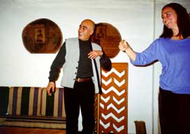 Now we will practice more of our songs in the hotel room... We have been singing Iraqi and Egyptian songs for the brothers' uncle, J., who has been showing up with his new young wife... she is a second wife... the first one lives in Bagdad... J. is serious and jolly at the same time... was a military man until he got shot in the war against Iran... now retired, he comes over to discuss stories and philosophies about women with his two nephews... Kristina and I throw in our two cents from time to time... J. is enjoying a renewed youthful vigor from this second marriage... but Ali says it probably won't last because J. is very responsible toward his first wife and the 10 children they have... we ask questions: to get married the man must give money to the woman... to get divorced the man must also give money to the woman... to be married to more than one woman the man must be able to afford this... if he gives something to one wife he should give the same to the others... but the women cannot initiate divorce proceedings the way men can unless the husband is physically abusive... this is "because women are more passionate and might make decisions impulsively..." but to guard against impulsive decision-making by the men it is customary to give the couple 3 chances to get back together if the man has announced that divorce is necessary... but only three... if he announces divorce three times then it is prohibited for them to try to get along any more... ...unless it is arranged for the woman to marry another man for a brief period of time, wait three months and then return for a fourth try... ...well it's all somewhat familiar and yet different... the marriages are arranged... if you like some girl you ask your parents to approach her parents... in J.'s case it is said that his father put a gun to his head and said, "you will marry this one..." when J. was only 17... here he is smiling and giggling away with his new second wife... obviously enjoying himself immensely...