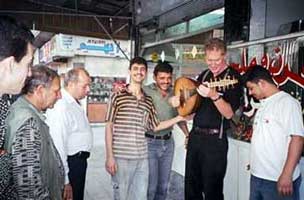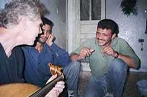 | Walking in the huge "Muhayim Filastini" -- Palestinian refugee camp -- south of Damascus, Syria, I was accompanied by my three strongest allies: my singer, my oud and my familiarity with the streets of the Arab world. Kristina is my singer, my oud is my oud and my familiarity comes from a lifelong curiosity to be with every kind of person in every kind of way so that I can find out WHO WE ALL ARE!???? It was just a short time before a Palestinian man pointed toward my oud case and asked for a song. Warning: don't carry an oud with you in the Arab world unless you are prepared to sing. You will tire yourself out from the effort of declining invitations. I sat in a little plastic chair in front of a tiny grocery store and withdrew my oud from it's case. Kristina and I began to sing Egyptian, Syrian and Lebanese songs as the crowd grew around us. A group of grade-school age children in their blue school uniforms gathered around close. Their favorite of the styles I could offer turned out to be Lebanese line-dance music. We returned to sing "An Nadda" over and over again at their insistence. One of the men who had initially invited us from in front of his store had assembled a plate of appetizers for us to snack on, but the singing would not stop. The children screamed for more and more until the crowd grew to such a size that unpredictable crushing waves of appreciative onlookers could have accidentally squashed me and my oud and my singer. Eating the offered appetizers was not possible in this situation, so we accepted an invitation to climb the stairs across the street to enter a bare room wherein we met and drank tea with six brothers, one sister and their mother. The 14-year-old sister was the only one in the family who spoke any English. But it didn't seem that her English was really any better than our Arabic. They were uproariously enthusiastic about the idea that Americans would show up on their streets singing Arabic music. There are several of these Palestinian refugee camps surrounding Damascus: Kabr Essit, Jaramana, Khan Dannoun, Khan Ashieh, Sbeineh and Yarmouk are among them. They were created in 1948. Several hundred thousand Palestinians are living in these camps hoping for the day when they, or, as they explain hopefully, at least their children, can return to the towns from which they fled. Returning to the streets, we made our way back toward the "old town" in the center of Damascus. Late that night I found myself playing another musician's oud and singing in the Umayid Palace Restaurant in the old traditional musical style with a Syrian audience appreciatively singing along as the qanun player and I discovered melodies familiar to both of us. We stopped for two nights in Latakia on our way to Aleppo. The hotel owners' family of 25 or so people gathered on one of the balconies of the hotel where Kristina and I and one of the uncles took turns leading the singing. Later that night the women took Kristina back into their rooms and kept her laughing for two hours while they played with each other and the children. I went with a few of the men to inspect ouds at a local workshop. The father had been making ouds there for the last 40 years and now the son is taking over the work. The following night we went to watch the young men and women dance "dabke" at a large seaside restaurant. Every day we are amazed at the glimpses we get into this Arab world. I don't think I have ever seen young men have as much uproarious fun as these guys did doing these highly improvisational but also traditional line dances. What can I say... you had to be there... And sometimes you just can't bring yourself to drag out the camera and poke it into the situation... Now we are in Aleppo... this is a place which has been continuously inhabited for at least 5000 years... some suggest 8000... It is the home of one of the most highly prized musical traditions in the Arab world: "qadoult arabiya." Ramadan began today. We stayed in the room to catch up on much needed sleep. We had breakfast with everyone else immediately after the sun set... We entered a restaurant about half and hour before this time so that we would be certain to find a seat... We sat at a large group table with a Syrian couple... An oud player and a singer appeared just before sunset. The singer sang the call to prayer for us in the restaurant and we began to break our day-long fast by eating dates... Kristina Writes: One thing I have noticed about the Arab world is the respect the teenagers have for the elders. I'm reminded of Margret Mead's observations in "Coming of Age in Samoa". I've yet to see a teenager make an angry or critical remark about his or her parent. It probably happens occasionally but I've yet to witness it. The other day in Lattakia, Syria I was "kidnapped" by two young girls, probably about 16 and 17 years old, and taken up to their apartment. The young sisters Rana and Hessin were eager to introduce me to their mother who obviously was loved dearly. Three aunts were there visiting along with several cousins of all ages and an uncle or two. The house was full of people all smiling and using whatever English they could come up with to communicate with me. They kept asking me to sing to them either the Lebanese "dabke" song "An Nada" or a Fairuz song "Atini Nay" or "Nassam Alaina." When a new person came in I would have to sing another line. They would all smile and giggle. They couldn't believe an American knew their music. Rana and Hessin and their mother would all say from time to time "I love you Kristina!" I felt so welcomed I honestly felt like crying, they were so sweet. At some point Hessin and I laid down on her bed with her English book and I helped her with her pronunciation. And she helped me with some Arabic words. She told me that she wished very much to learn English but that she did not have a good teacher. At this point I was fantasizing about staying here and making a living as an English teacher.